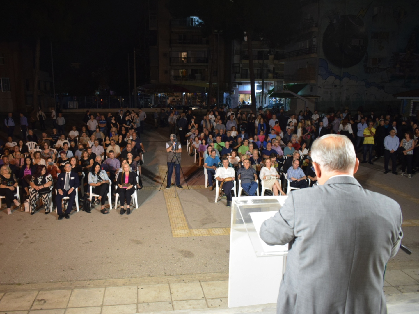 Σήμερα, εδώ στην αυλή του ιστορικού 1ου Δημοτικού Σχολείου Αμπελοκήπων, το οποίο ονοματοδοτήσαμε «Η ΕΠΤΑΛΟΦΟΣ», για να θυμίζει την καταγωγή των πρώτων κατοίκων από την Κωνσταντινούπολη, πραγματοποιούμε την τελευταία προεκλογική μας συγκέντρωση, πριν την ερχόμενη Κυριακή των εκλογών.