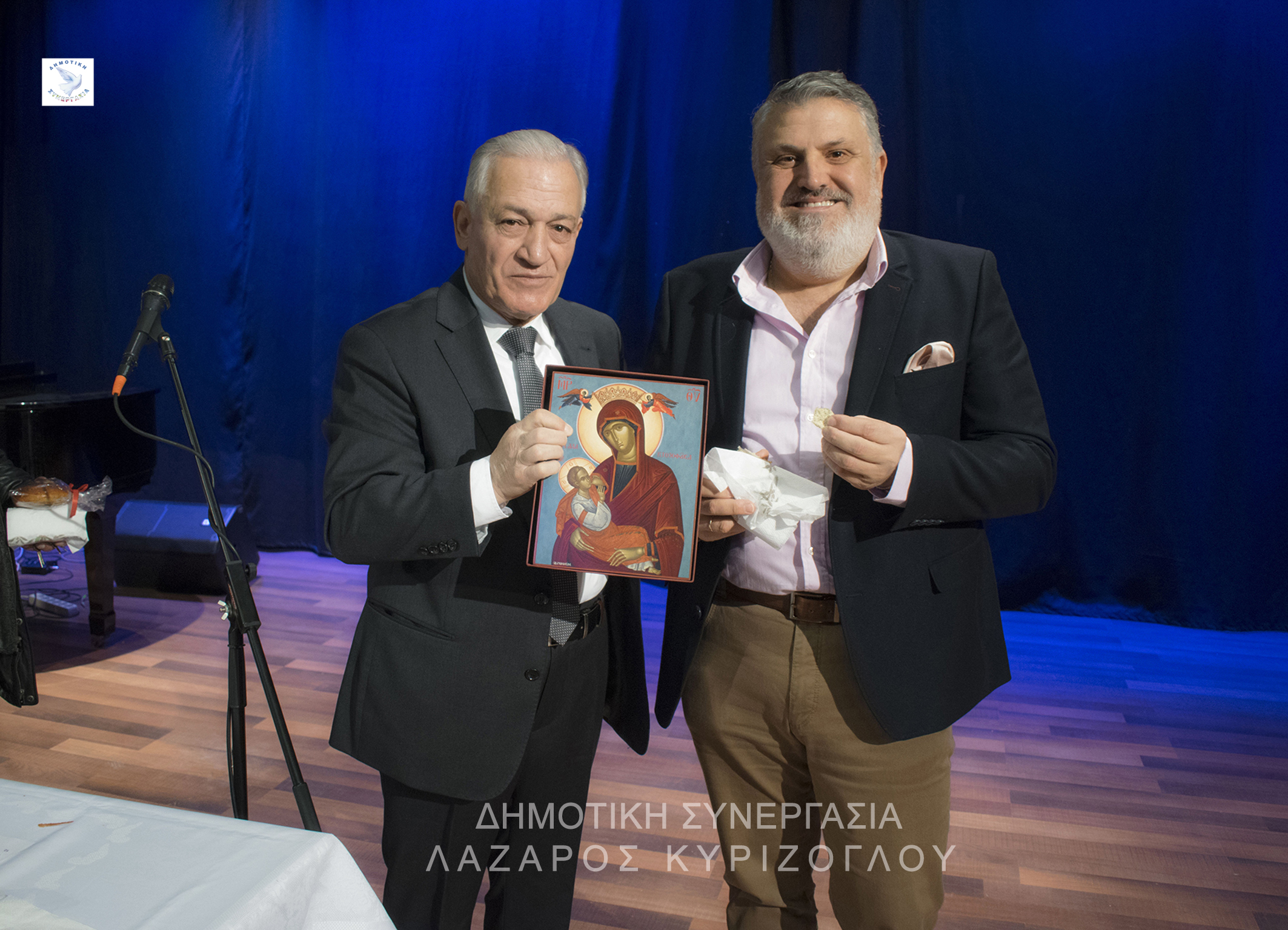 Τα φλουριά ήτανε δύο όπως και οι τυχεροί. Στην μεγάλη βασιλόπιτα το φλουρί έτυχε στον Πρόεδρο του Δημοτικού Συμβουλίου κ. Αλέξανδρο Κουσενίδη και στα βασιλοπιτάκια τυχερή ήτανε η κ. Στέλλα Γράβα. Ο κ. Κουσενίδης και η κ. Γράβα παρέλαβαν από το Δήμαρχο από μία εικόνα της Παναγίας.